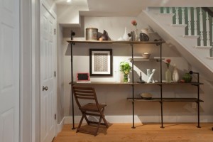 An under-stair desk like this one serves a double purpose in design and space maximization. Read more on Homedit.com. (Hint, you’ll find even more pipe shelving design ideas here.)